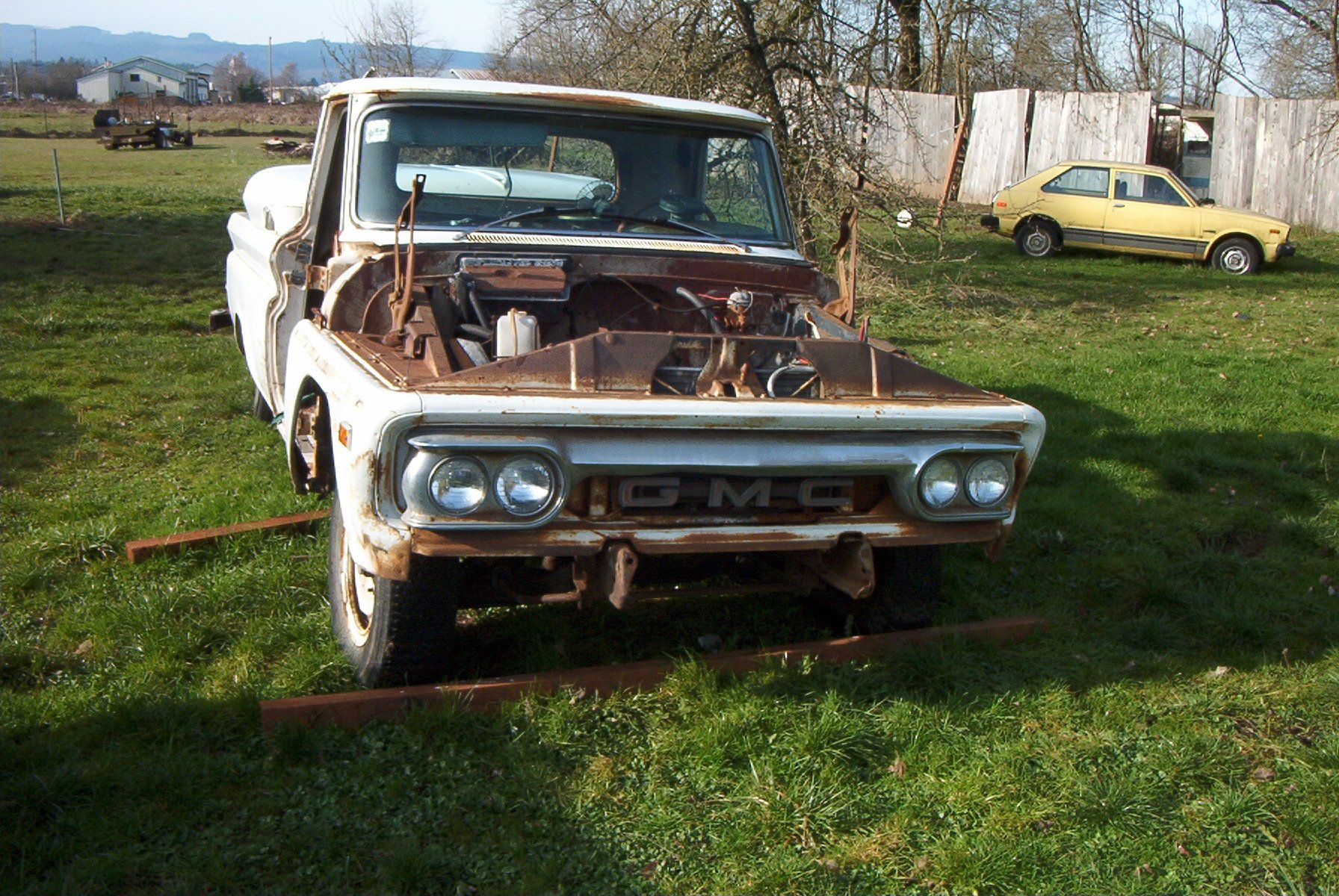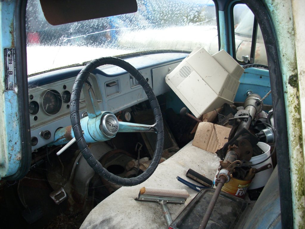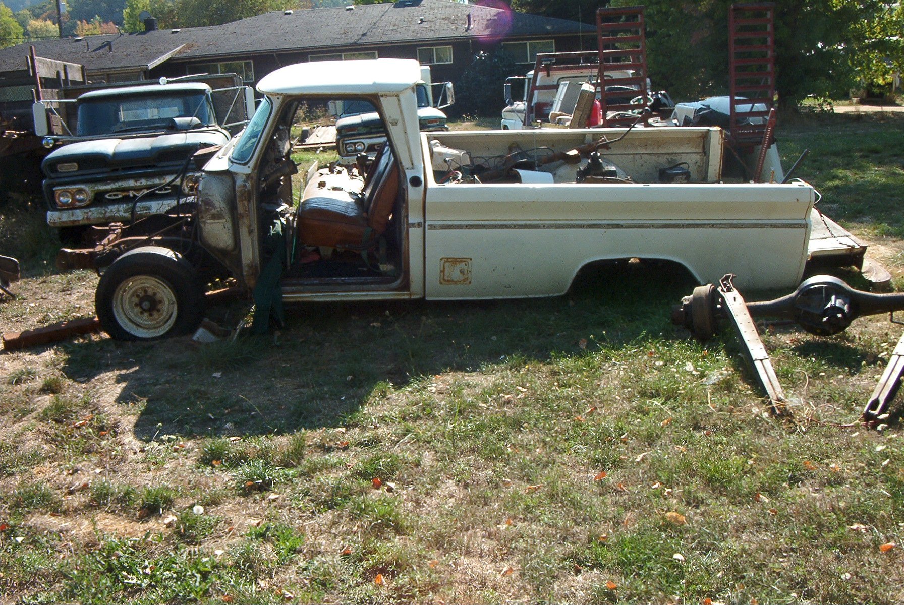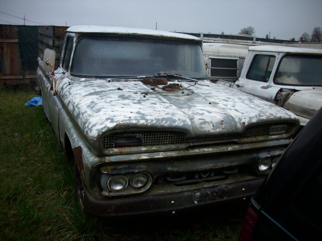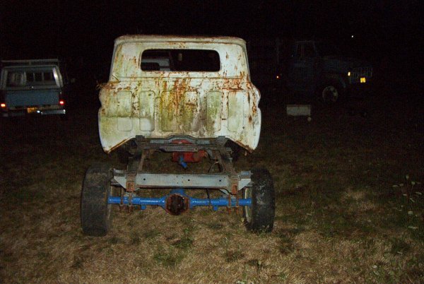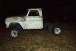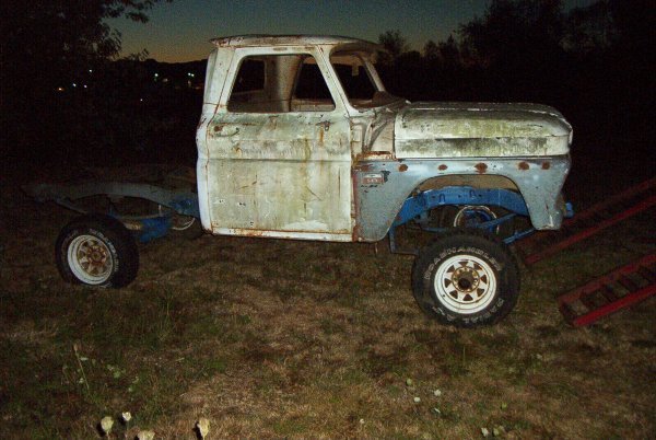 1966 GMC 1500 truck. Bought solely for parts. I have already gotten rid of the cab and nose clip, all that is left is the chassis. I had a chance to play with some parts though, I briefly had a 1962 4x4 chassis here, and the person who wanted that also wanted the cab and clip. So to make things easier to haul, I put the body on the chassis. And discovered that the cab mounts on the earlier trucks don't line up at all with the cab mounts on the later trucks. Only mounts that were close were the two for the radiator support.