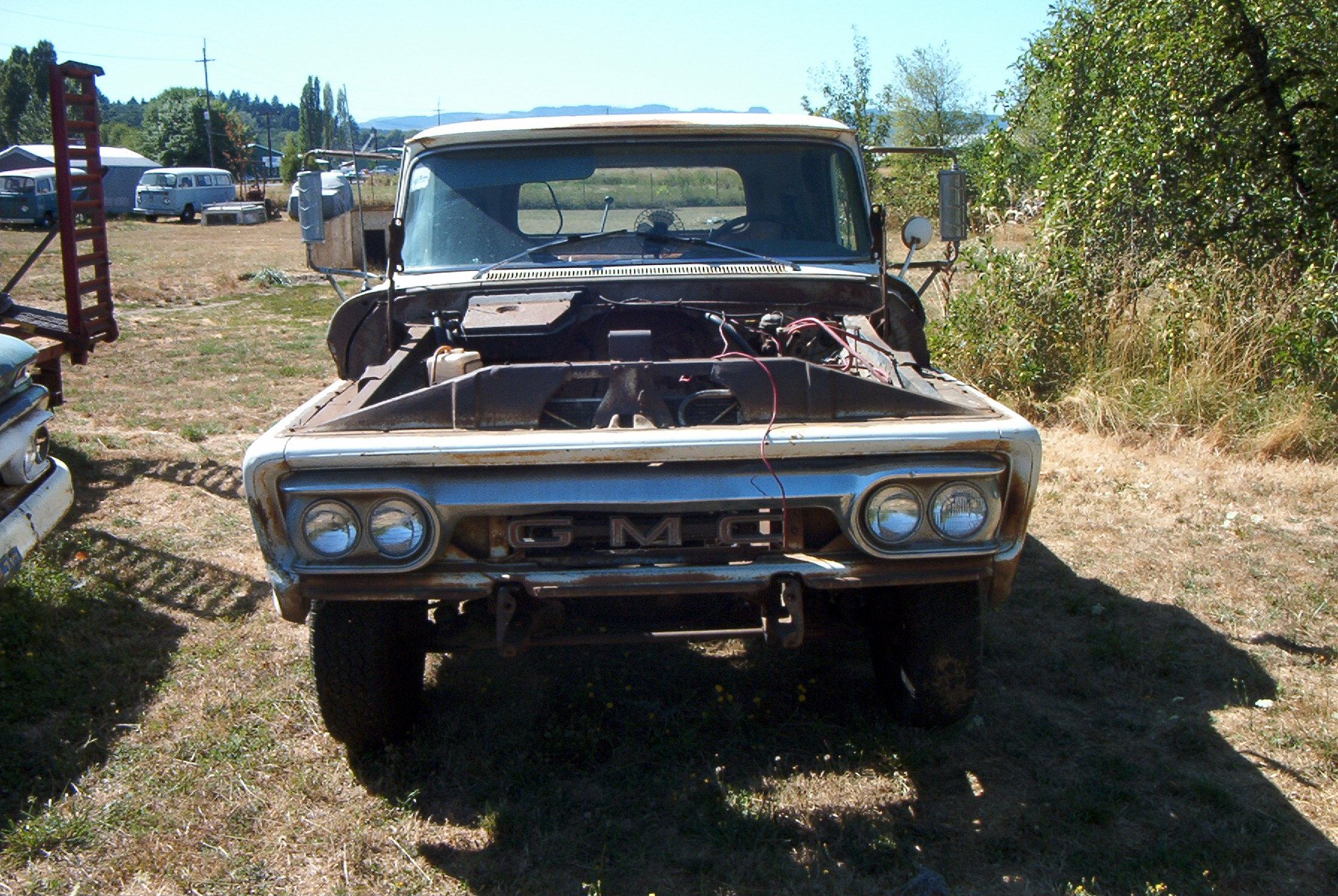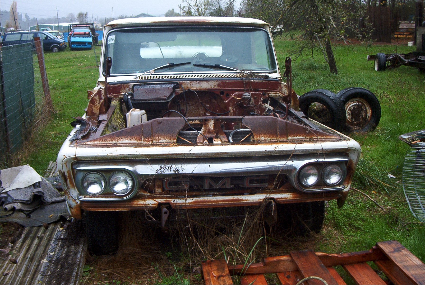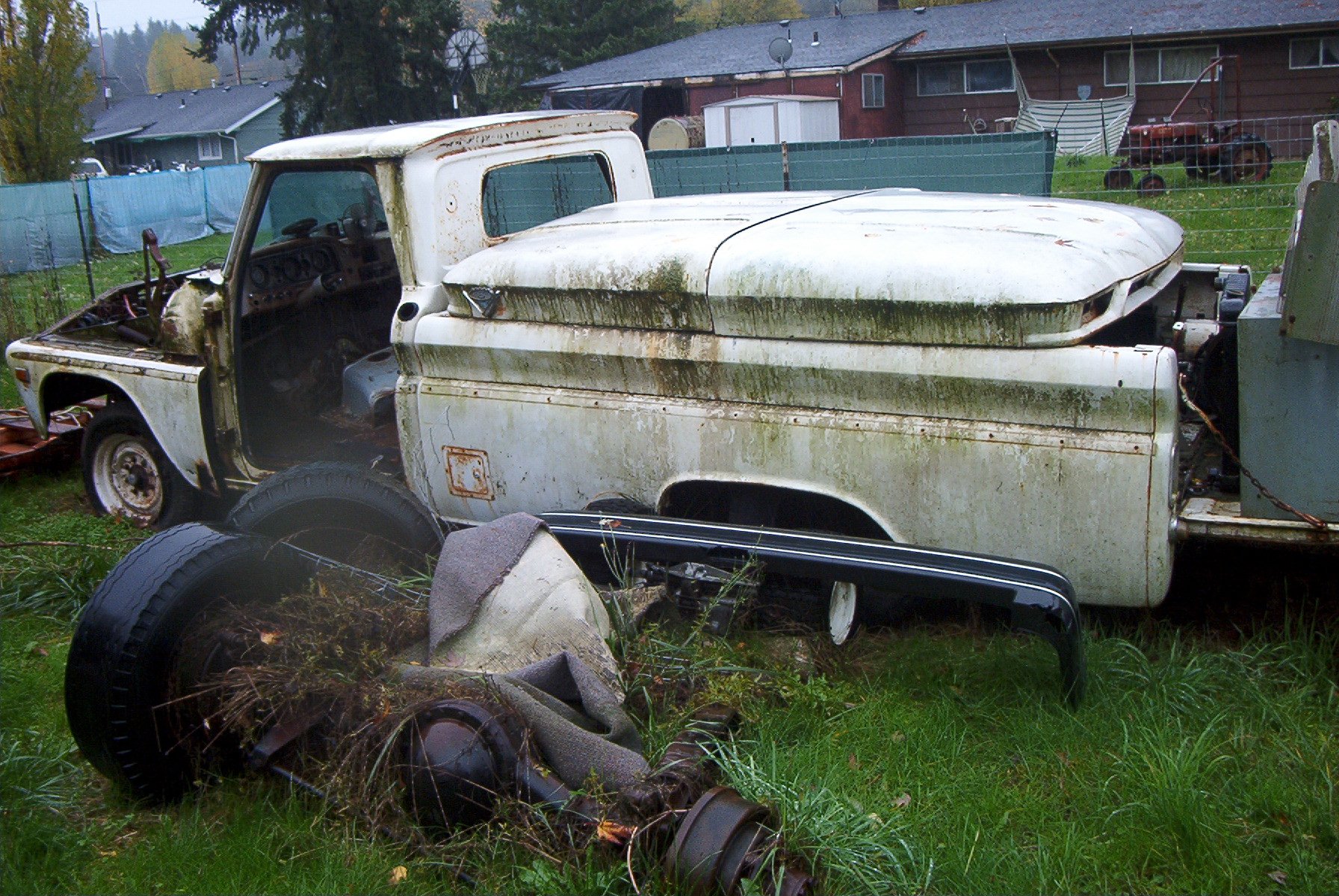 1966 GMC 1500 truck. Bought solely for parts. I have already gotten rid of the cab and nose clip, all that is left is the chassis. I had a chance to play with some parts though, I briefly had a 1962 4x4 chassis here, and the person who wanted that also wanted the cab and clip. So to make things easier to haul, I put the body on the chassis. And discovered that the cab mounts on the earlier trucks don't line up at all with the cab mounts on the later trucks. Only mounts that were close were the two for the radiator support.