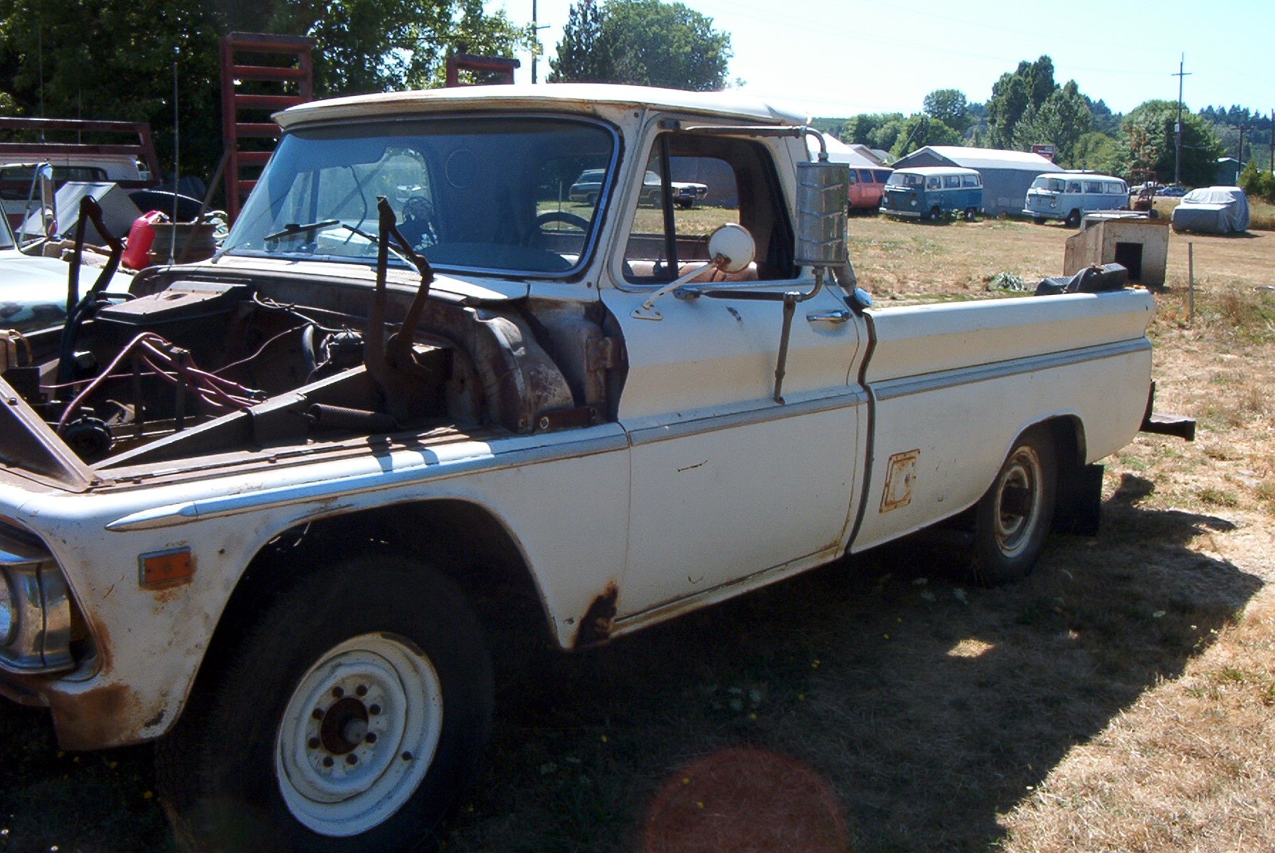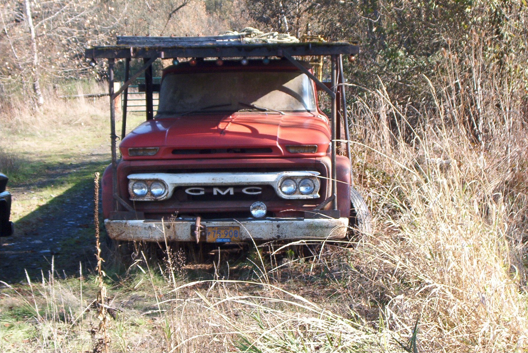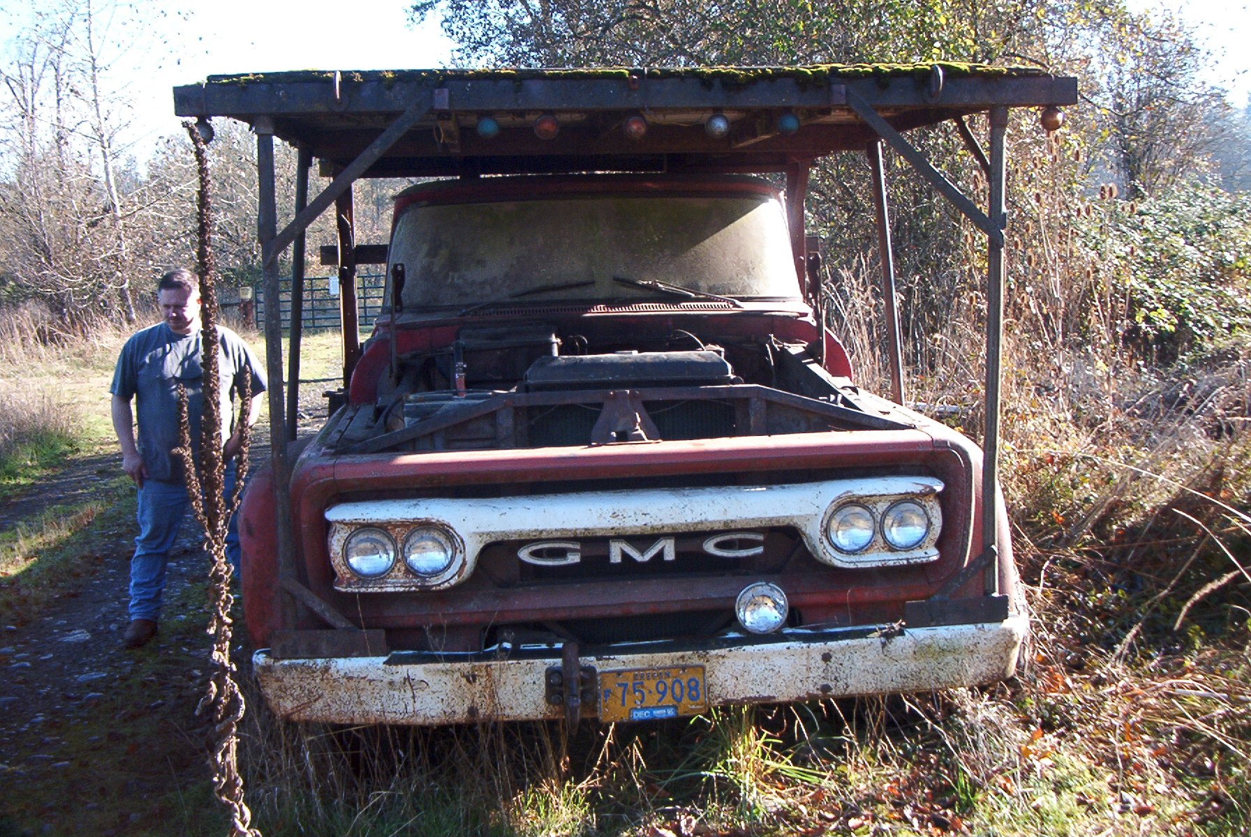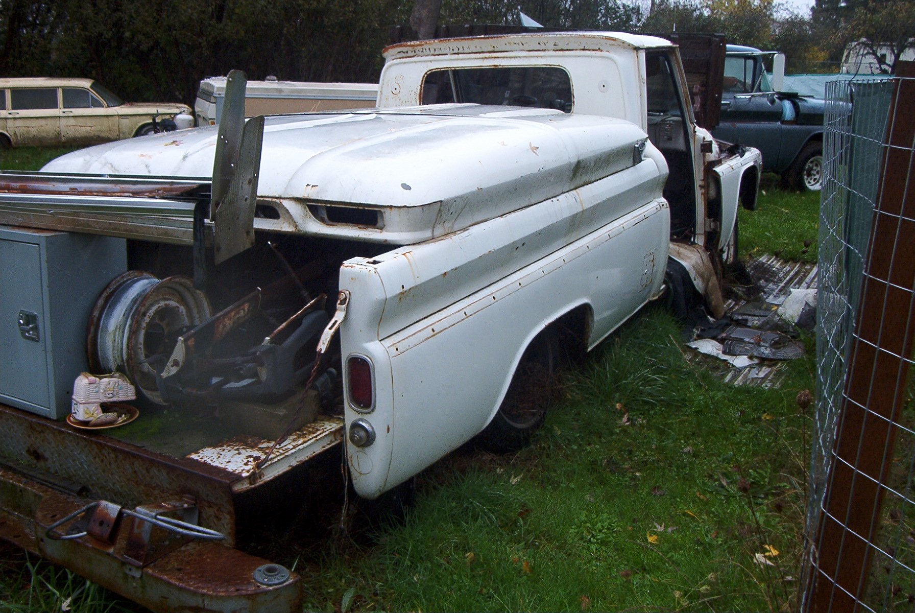 1966 GMC 1500 truck. Bought solely for parts. I have already gotten rid of the cab and nose clip, all that is left is the chassis. I had a chance to play with some parts though, I briefly had a 1962 4x4 chassis here, and the person who wanted that also wanted the cab and clip. So to make things easier to haul, I put the body on the chassis. And discovered that the cab mounts on the earlier trucks don't line up at all with the cab mounts on the later trucks. Only mounts that were close were the two for the radiator support.