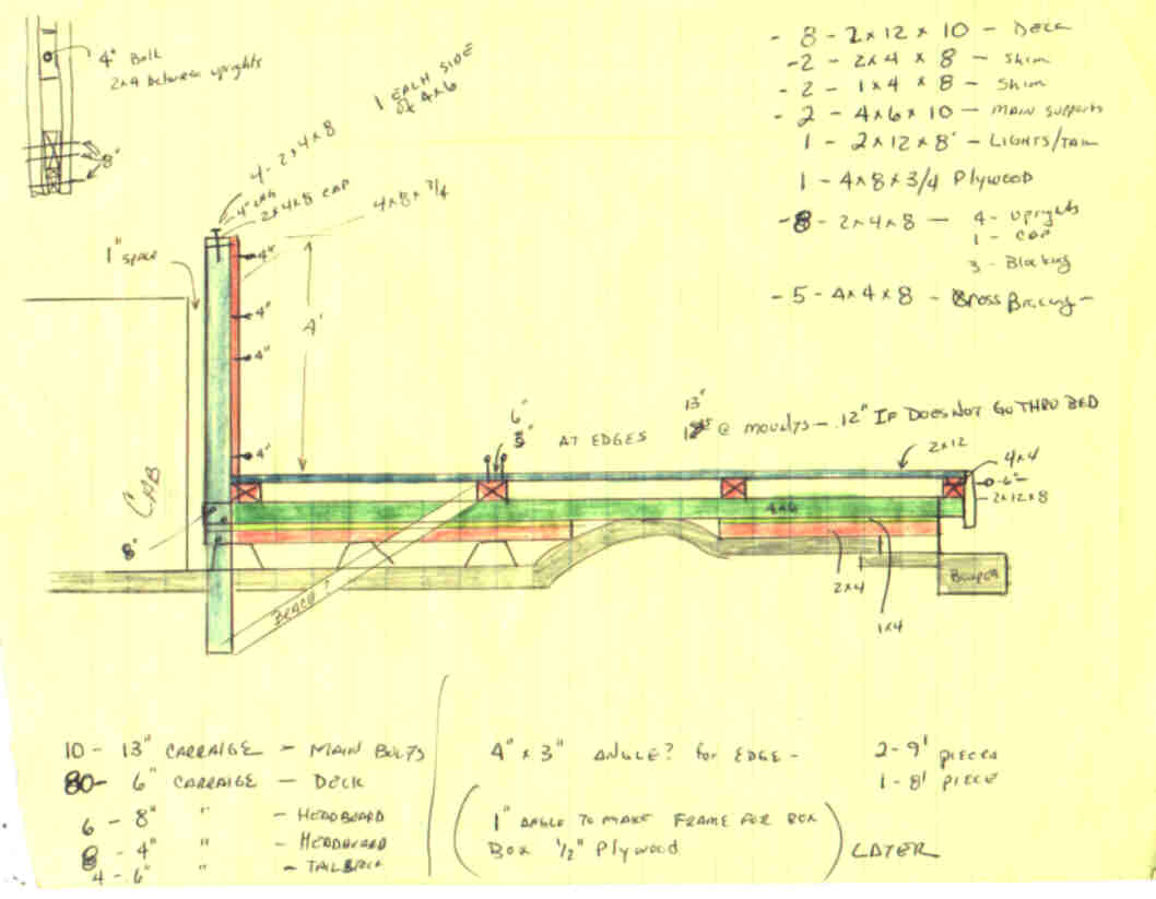 1)Details of the Headboard, Basic sketches of the bed area and how I planned on getting it to mate with the frame of the truck. Heights were determined by placing extra pickup box supports on the factory mounts, then replacing those with appropriate heights of lumber. In this case, it took a 2x4 and a 1x4 to level everything out.2) This is a more detailed drawing of how the bed was laid out. I attempted to color code everything. It helped my thought processes to see *everything* as I hoped it would look. Obviously it is not to scale. The differences between this drawing and the actual bed are: